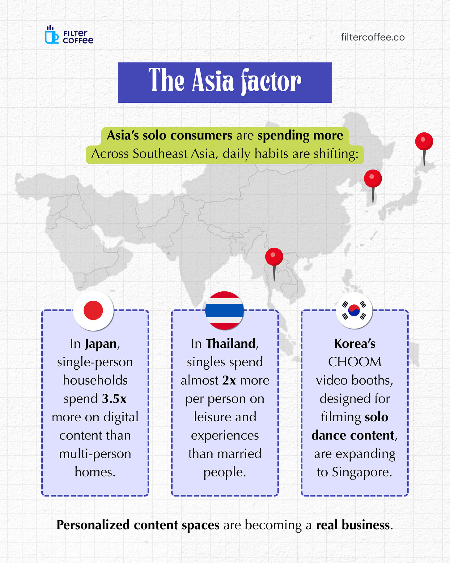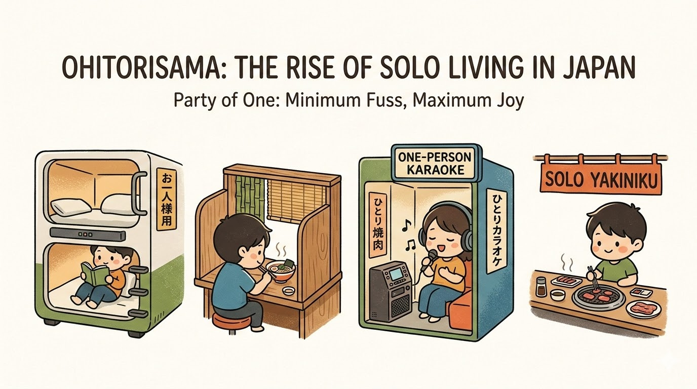 Japan has lived with a solo consumption culture for decades. Nearly 40% of households in Japan are single-person households, and entire industries have emerged around this behaviour.