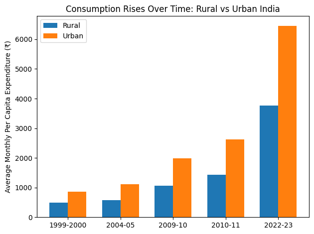 The Household Consumption Expenditure Survey (2022–23) shows that the average person now spends about ₹3,773 per month in rural areas and ₹6,459 in urban areas. Economists track this using MPCE (Monthly Per Capita Consumption Expenditure), a metric that measures how much individuals spend on average.