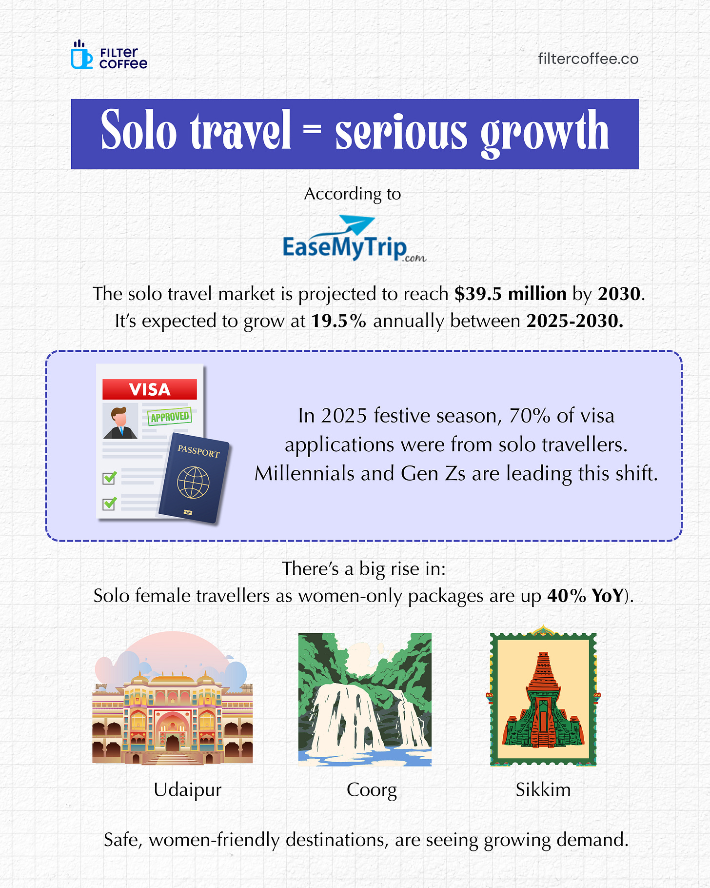 The solo travel market in India is growing at roughly 19.5% CAGR between 2025 and 2030, and some platforms report that solo female travel bookings have grown nearly nine times year on year.